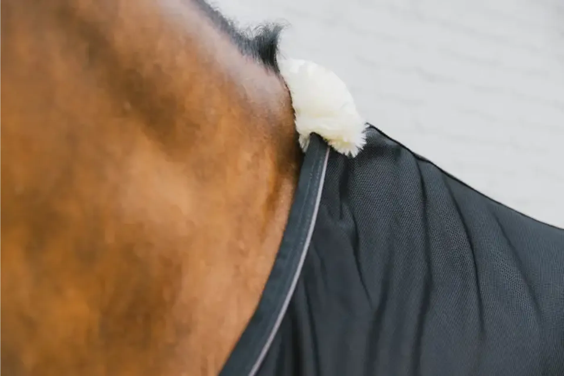 Our commitment to quality and sustainability is stitched into every fiber of the Mesh Fly Sheet. The rug features a highly breathable and durable material that allows a refreshing flow of air, ensuring your horse stays comfortable while being protected from insects. On the inside of the chest part, we added 210D to avoid rubbing at the shoulders. The removable surcingles and artificial sheepskin at the wither add extra comfort.