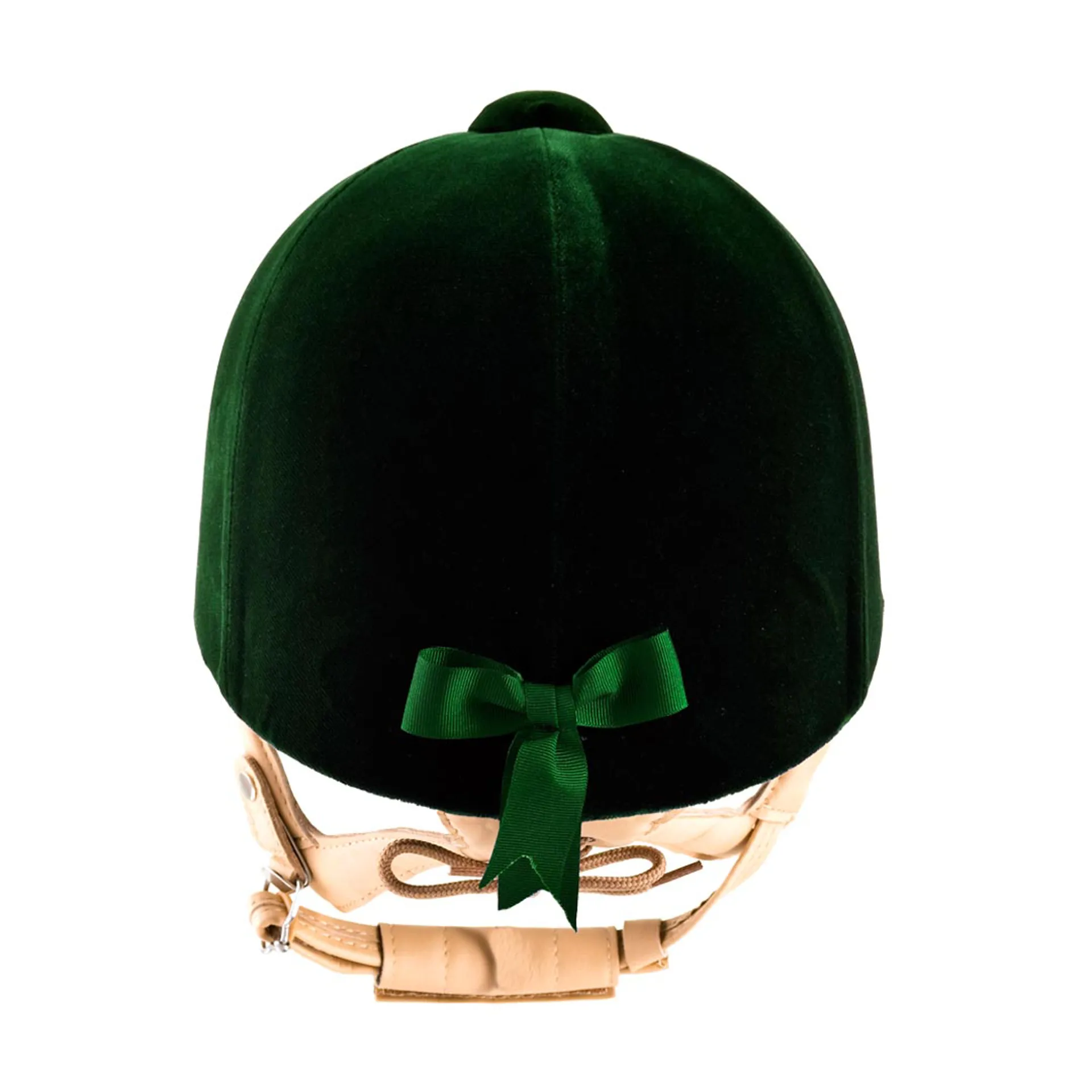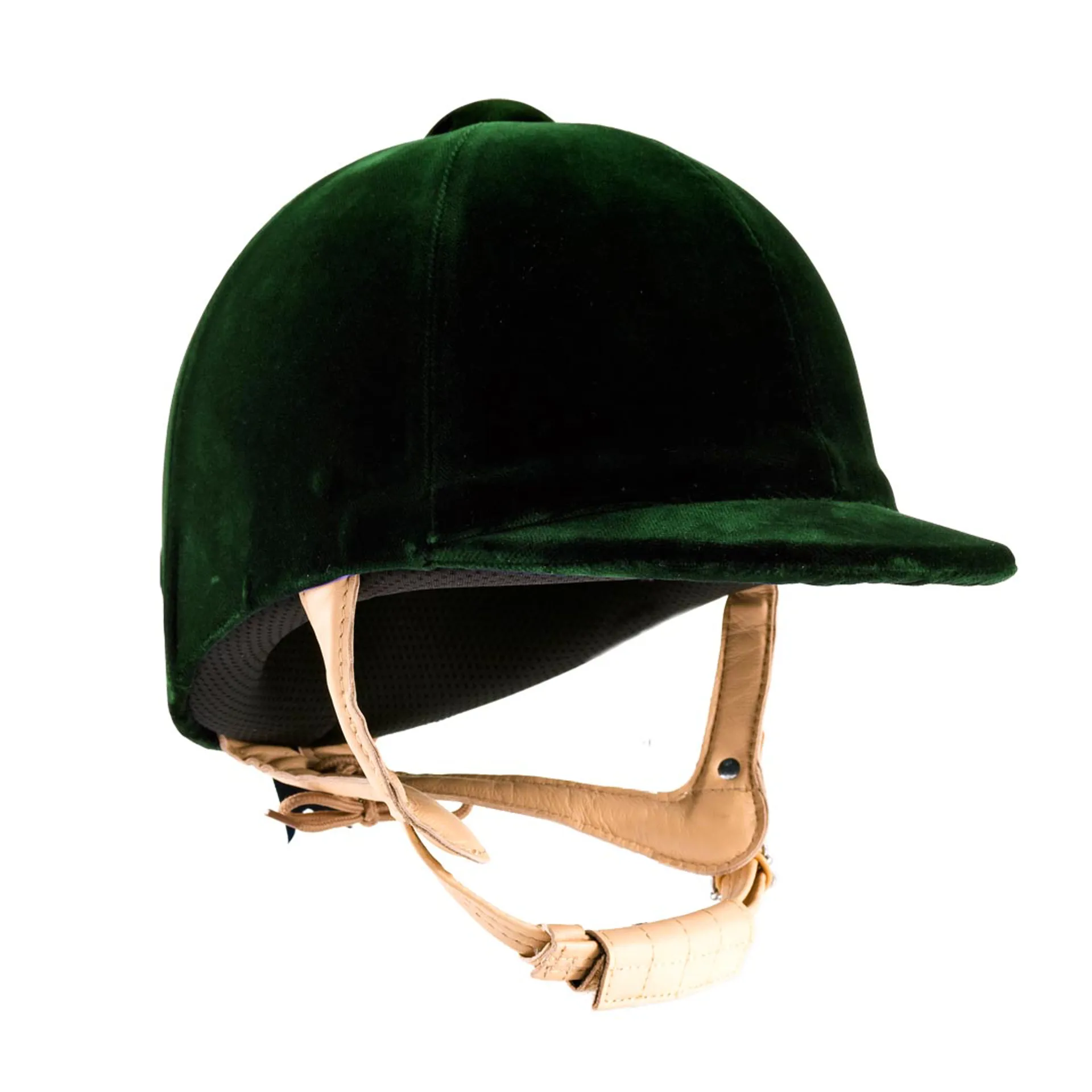 • A slim profile peaked helmet covered in high quality velvet with a coordinating hat button and ribbon.